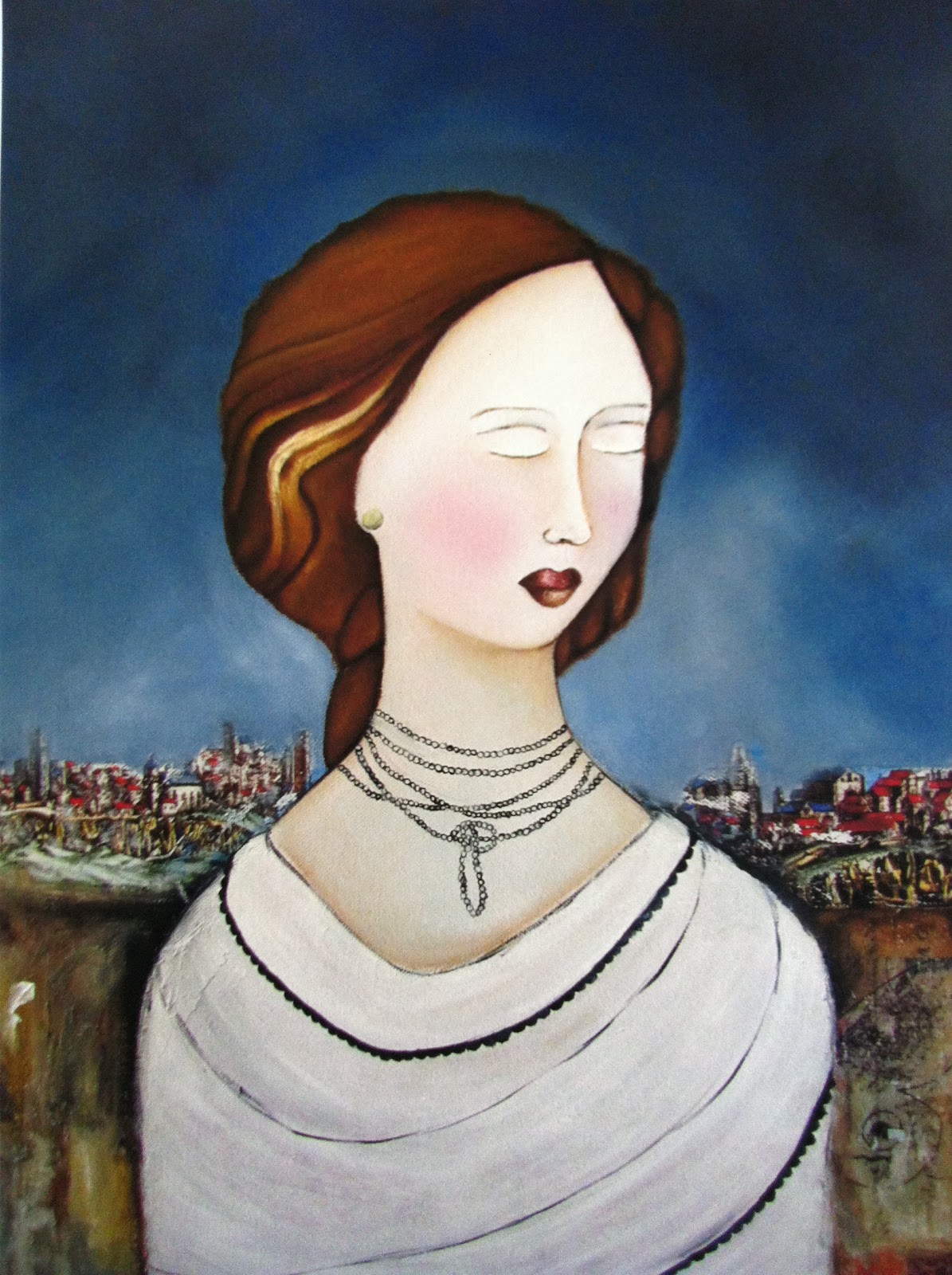 When we got home I started painting and decided to finish working on my The Journey - Dreaming of Orvieto painting... I had be struggling with what to do with the dress.  Nothing I did seemed to be working.  I eventually took a photo of this piece and printed it out and drew some rough designs on it... and this is where I got the idea for the necklace - which I just love and a few hours later her dress evolved to this.  I am delighted with where this piece ended.  I have to say that I am more delighted that I finished this piece.  Sometimes finishing a piece for me, is more difficult than the actual piece itself.